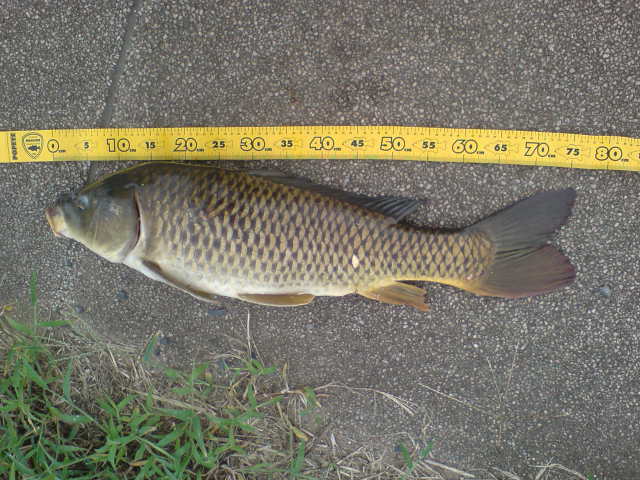 時々 釣果1本ヒットフライ パンフライ(白)自作 利根川水系増水の為、釣りが出来ず だけど朝早く起きたので、フライに行って来ました。ターゲットは鯉です。 実は、フライで鯉が釣れることを知って始めたのがきっかけで、3年振りぐらいの釣行です。 釣り方は、サイトで鯉を探して、まずチャーミング(撒き餌)してその中に、フライをドライで一緒に流して釣る、やり方です。 6時に釣り場に到着 先ずはサイト で鯉を探索 小さな流れ込みに鯉発見![]() 食パンを千切ってかなり上流からチャーミング それに鯉が気付き何個かパクリ このタイミングで、パンフライ投入 ![]() 鯉がパンフライ発見 しかし鯉は、目がいいので食べる寸前で見切られる ![]() こうなるとダメなので、違うターゲットを探しに移動 ![]() ![]() 鯉も、流れ込みに溜まり易いので、違う流れ込みですぐ発見 しかし近づき過ぎて、気付かれて何処かへ消える ![]() その後何回か見つけるがアプローチに失敗してフライ投げれず ![]() 一番初めに見つけた鯉が、まだうろうろしてたので、今度はチャーミングの後フライを沈ませてチャレンジ ![]() なんと 何の違和感なくフライをパクリ ヒット![]() ![]() ニジマスとは違うトルクフルな引き 15分ぐらい格闘の末 なんとかキャッチ ネットですくうと、なんとネットから尾ひれがはみ出る。 ちゃんと測ると75㎝オーバー ![]() 今まで釣った魚の最大を更新しました。 それにしてもいい引きでした。